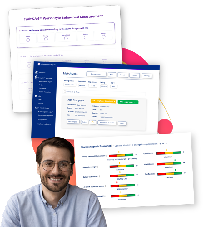 With real-time openings visibility, TraitDNA™ measurement, AI impact insights, and precise matching with your Job Opportunity Score™, you’ll apply smarter, waste less time, and get hired faster.