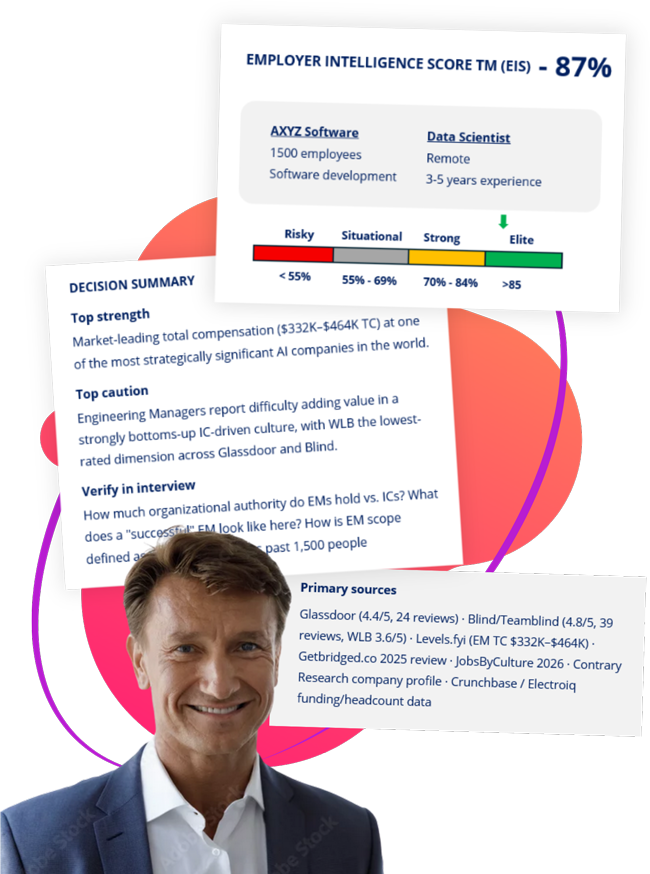 Rates any employer for your occupation across six evidence- based dimensions, derived from public data, independent of employer advertising, unavailable on job boards.